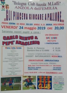Il Bologna Club Anzola “M.Laffi” organizza una cena con ospiti gli ex giocatori del Bologna F.C.: Carlo Nervo e Pepé Anaclerio.